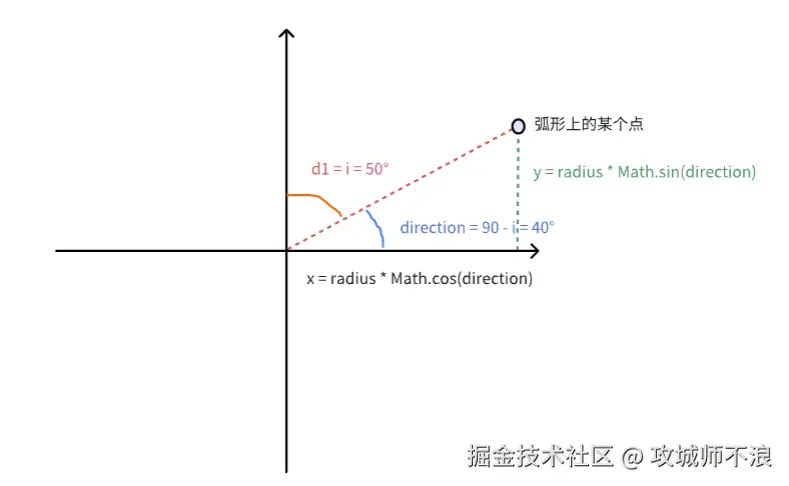 我们就要计算图中红色点的x,y,所以,这里需要运用勾股定理去求,而direction就是弧形上的每个点对应的角度,最终得出的x和y再分别与中心点的x和y相加,得到最终的定位。