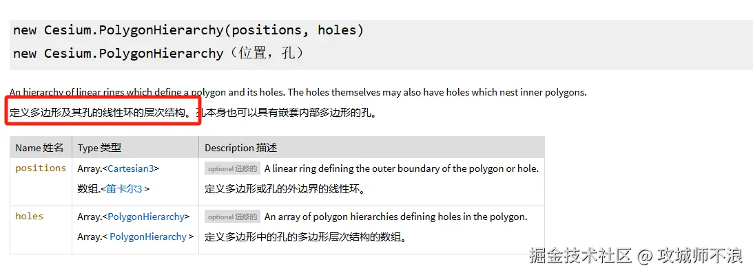 大家可能注意到了,我们本来是想画一个扇形,为什么要用polygon这个几何实体,因为它具备hierarchy这个参数,它是PolygonHierarchy的实例