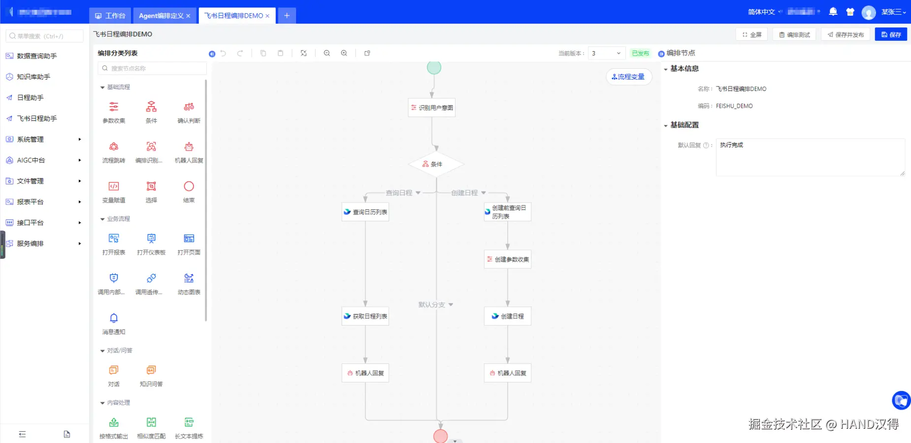 通过自然语言处理技术识别用户的意图,判断其是希望查询还是创建日程。这一步由汉得H-Copilot融合AIGC平台完成,感兴趣可以查看往期推文。