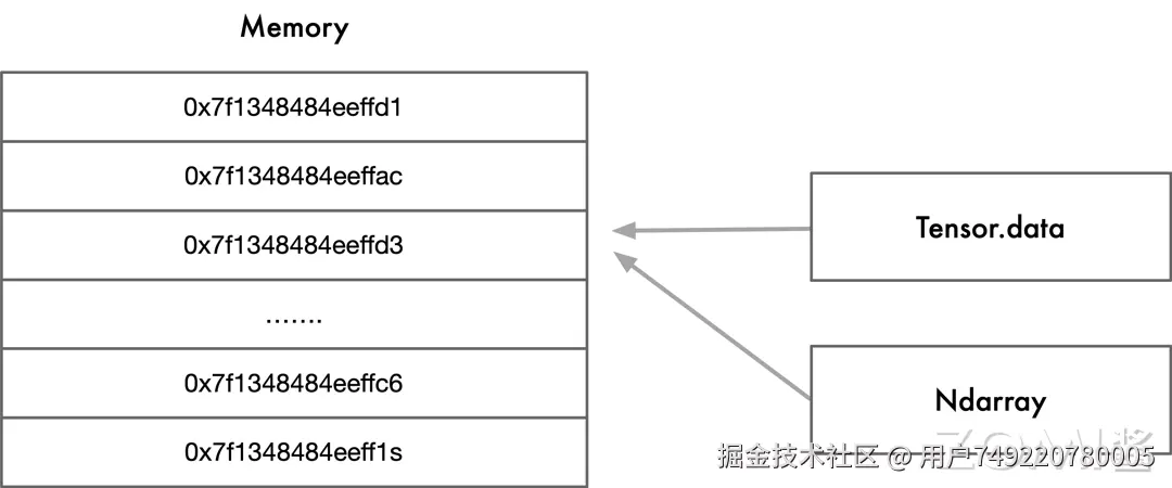 我们对其进行了转置操作,但实际上并没有改变其实际的存储,换句话说,交换维度后的张量与原始张量共享同一块内存,那么此时元素在存储逻辑上 14 相邻,42 相邻,25 相邻等等,但其在存储的物理结构上还是 12 相邻,23 相邻。