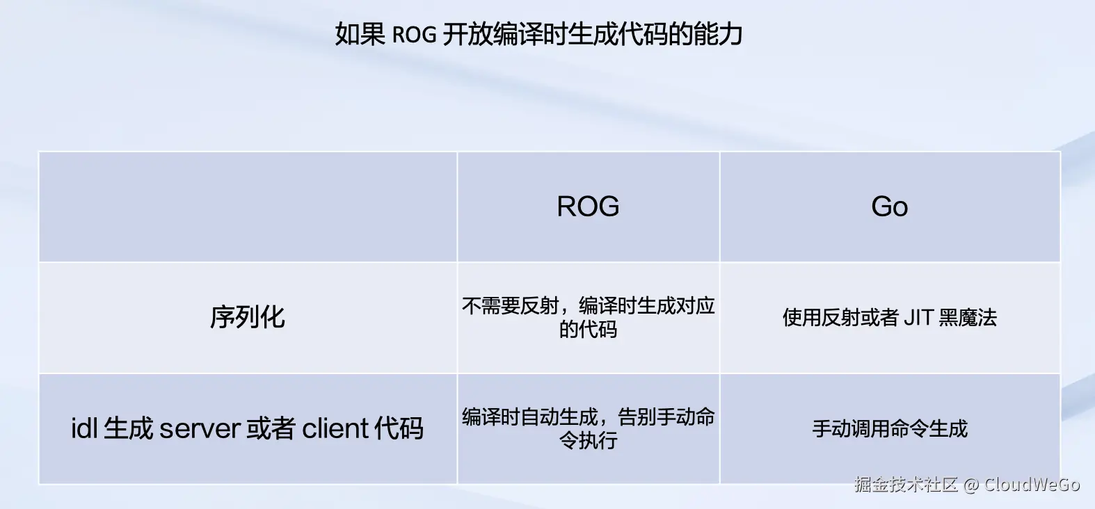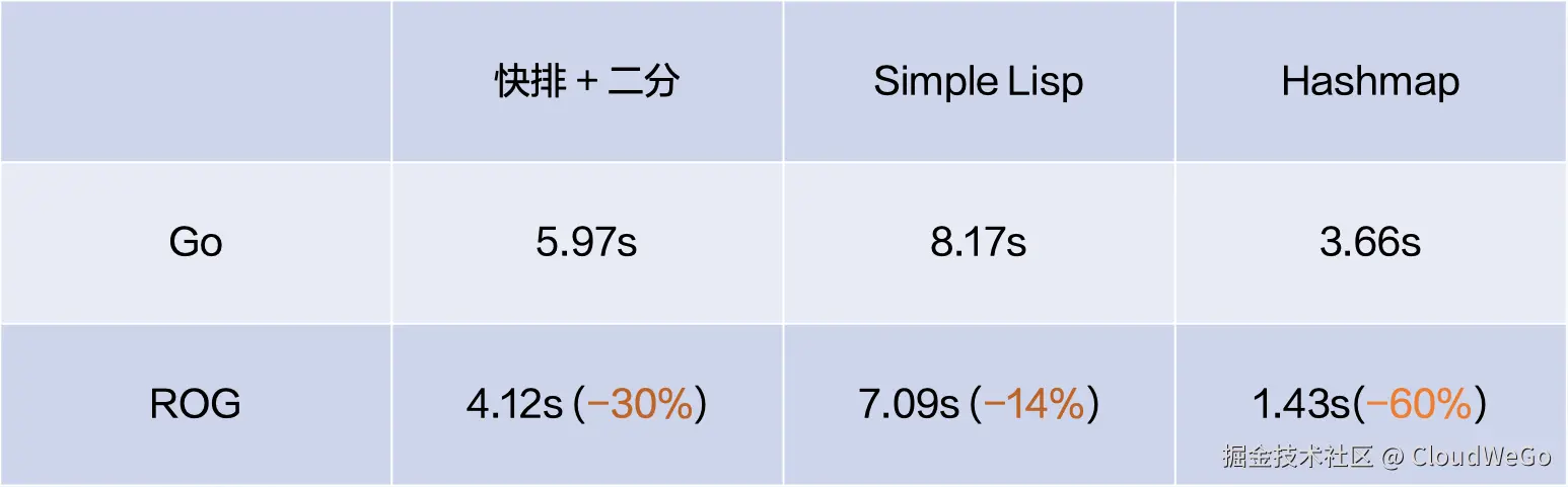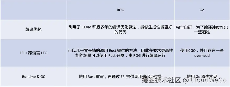 第一部分,编译优化。因为 ROG 利用了 LLVM 积累多年的编译优化算法,能够生成一些性能更好的代码,而 Go 的编译优化会为编译速度做出一定牺牲。