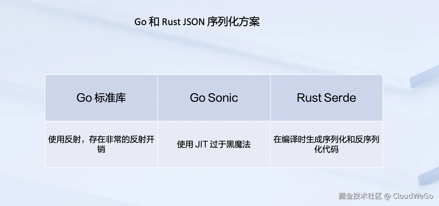 Rust 宏在我看来是一个非常强的功能,因为 Rust 宏可以简单地在每个 Rust 进行标记,申明这个结构可以提供 Serialize(序列化)和 Deserialize(反序列化)这两种方法。这样就可以在编译时为它生成序列化和反序列化的代码,直接进行调用,而不需要像 Go 原始的 JSON,它有反射开销。而这种反射开销在需要高性能的序列化场景会有很大的性能开销。为了解决 Go 的反射开销,sonic 做出了 JIT 反感,而 JIT 对开发 sonic 的开发者来说,负担是非常大的。