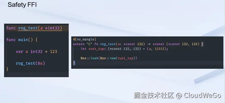 左边这张图是用户写的一份 Go 代码,里面有函数。rog_test(a *int32) 这个函数可能就是 FFI 提供的一个外部函数。如果用户直接去调用这个外部函数,而 rog test 本身是由 Rust 实现的,如右图,当我们写出这样的代码的时候,会发生什么事情?