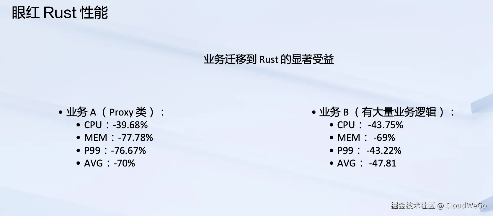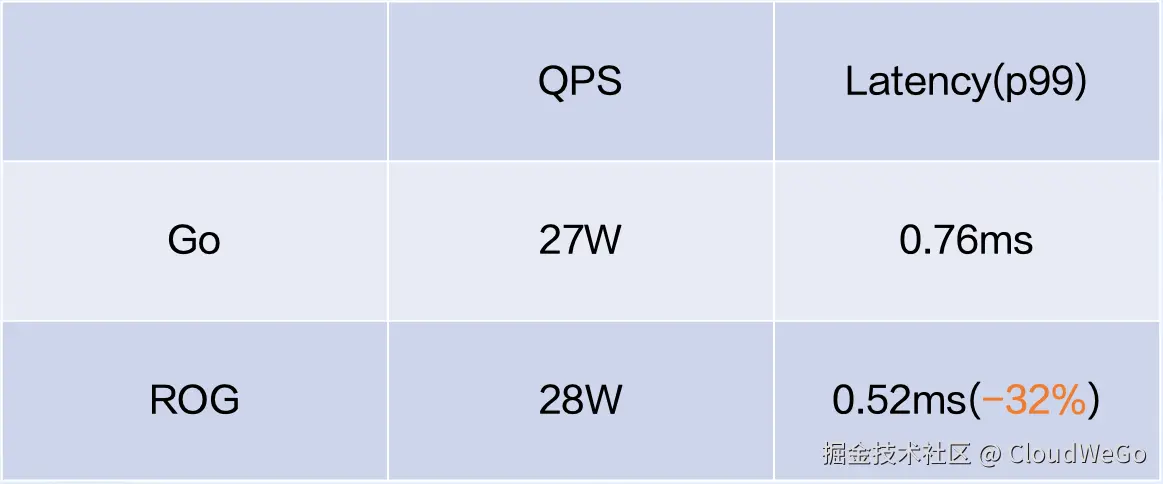 ROG 的诞生是因为我们一部分业务使用 Rust 重写之后,获得了非常好的收益,比如 AVG、CPU、MEM、P99,这些数据表现非常好,大约节省了接近 50%的 CPU,内存大大降低。这个性能数据让人眼红,因此团队考虑既然 Rust 有这么好的性能,我们有没有办法提升一下用户在 Go 上的性能?