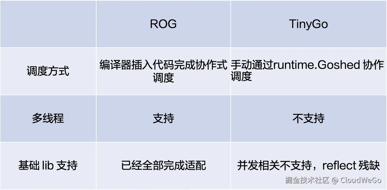 如果大家之前了解过 TinyGo,就会发现 TinyGo 的思路和 ROG 非常接近——TinyGo 也是把 Go 的源码给翻译到 LLVM。我们可以回想下在使用 TinyGo 的时候遇到过什么问题。