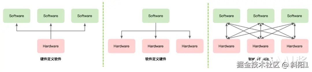 在计算机系统的发展历程中,硬件和软件的关系经历了从"硬件定义软件"到"软件定义硬件"的转变。早期的计算机系统,如早期的操作系统,其系统业务逻辑主要由硬件实现,软件只是起到辅助作用,并且软件的构建依赖于硬件提供的接口。然而,随着计算机技术的不断进步,"软件定义硬件"的概念逐渐兴起。
