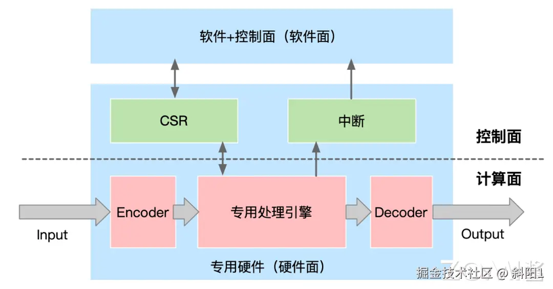 除了 CPU 和 GPU 异构以外,AISC 在异构体系中也扮演着重要的角色(如下图),尤其是对于 AI 加速。其通过驱动程序和 CSR 和可配置表项交互,以此来控制硬件运行。和 GPU 类似,ASIC 的运行依然需要 CPU 的参与: