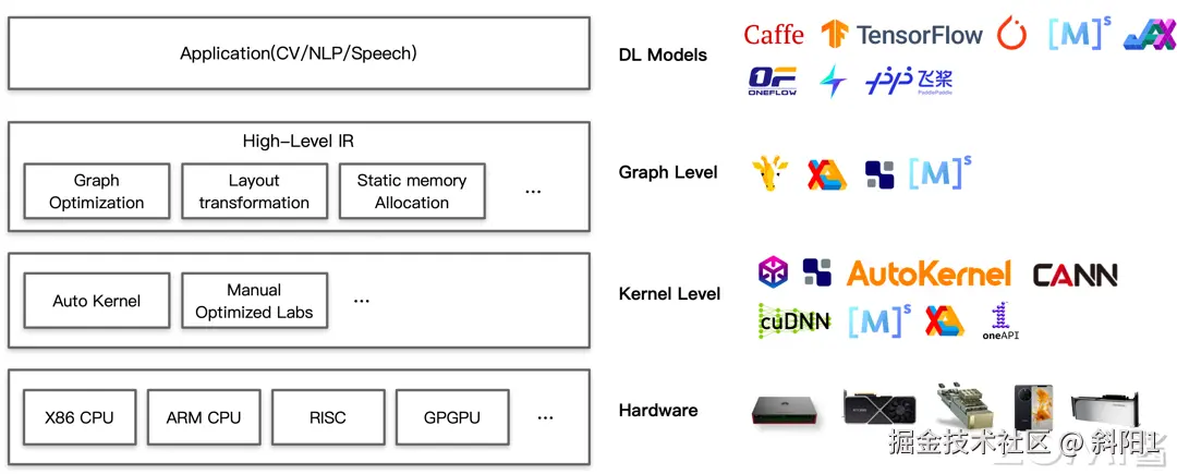 硬件接口抽象:GPU、NPU、TPU、CPU、FPGA 和 ASIC 等硬件的接口抽象。统一的硬件接口抽象可以复用编译优化策略,让优化方案与具体底层的 AI 硬件设备和 AI 体系结构适当解耦。