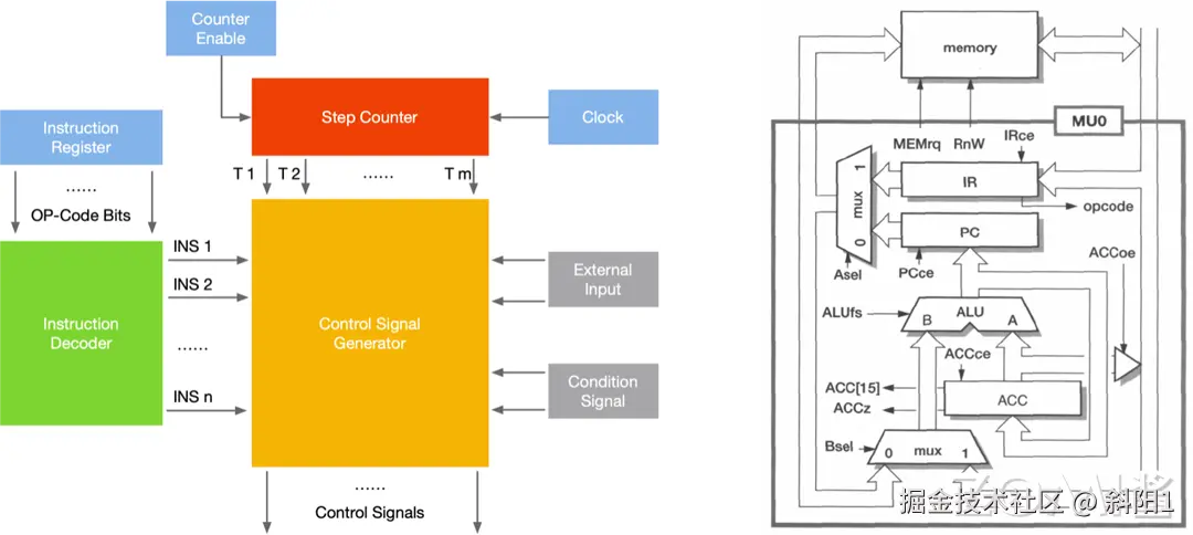 学习了控制单元 CU 的工作任务就是接收指令,指挥执行。我们接下来看看 CU 的工作过程如下图所示,CU 所接收的输入有三个:节拍发生器(Step Counter)、操作译码器(Instruction)、标志信号(Condition Signal)