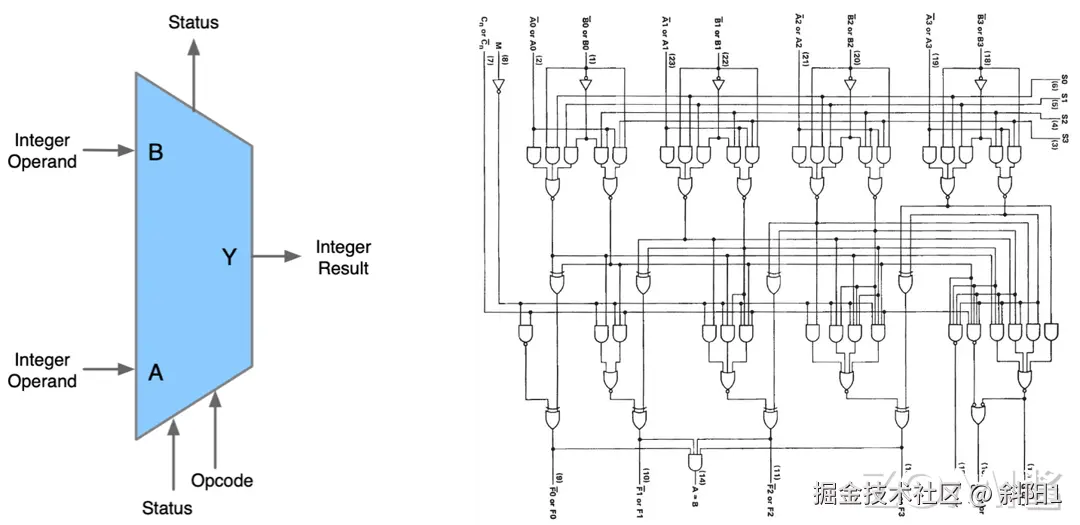 CPU 的主要功能就是运算,这正是通过算术逻辑单元(ALU,Arithmetic Logic Unit)实现的。ALU 电路内部由算术单元(AU)和逻辑单元(LU)组合而成,可对两个输入值(操作数)执行算术或逻辑运算并产生一个输出值。