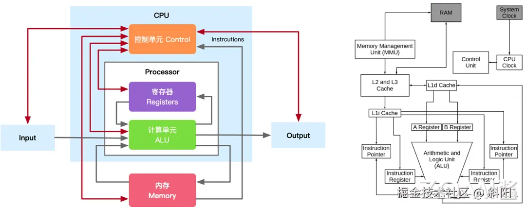 结合下图简单解释,第一步就是从内存里面去读取一些指令,给到控制单元 CU,而控制单元就会对刚才读取的一些指令来进行解码,变成正式的一些 command 命令,然后 ALU 就会去执行这些 command,这些命令执行完之后就会存储回来内存进行汇总也就是写回。