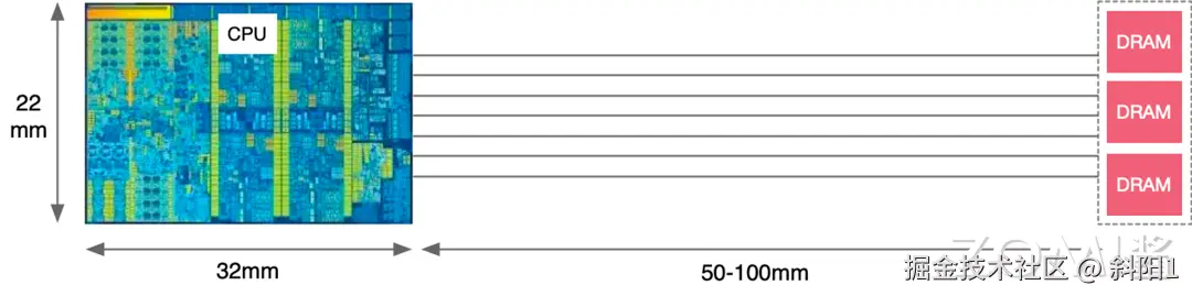假设计算机时钟频率为 3,000,000,000 赫兹(3 GHz),意味着每个时钟周期大约为 1 / 3,000,000,000 秒 ≈ 0.333 纳秒,电信号在导体中的传播速度约为 60,000,000 米/秒,根据上图可知,从芯片到 DRAM 的信号传输距离大约为 50-100 毫米,