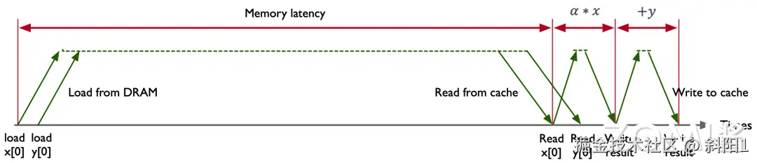 在 O(n) 的时间复杂度下,根据 n 的大小迭代计算 n 次,在 CPU 中串行地按指令顺序去执行 程序。以 Intel Exon 8280 这款芯片为例,其内存带宽是 131 GB/s,内存的延时是 89 ns,这意味着 8280 芯片的峰值算力是在 89 ns 的时间内传输 11659 个字节(byte)数据。 将在 89 ns 的时间内传输 16 字节(C/C++中 double 数据类型所占的内存空间是 8 bytes)数据,此时内存的利用率只有 0.14%(16/11659),存储总线有 99.86% 的时间处于空闲状态。