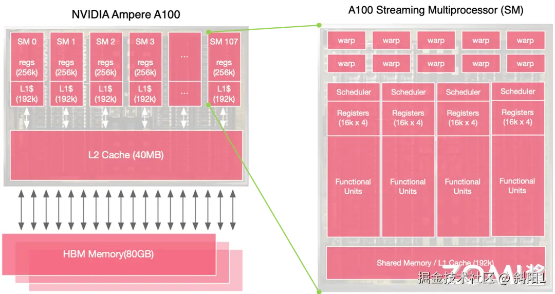 其中寄存器(Register)文件也可以视为缓存,寄存器靠近 SM(Streaming Multiprocessors)执行单元,从而可以快速地获取执行单元中的数据,同时也方便读取 L1 Cache 缓存中的数据。此外 L2 Cache 更靠近 HBM Memory,这样方便 GPU 把大量的数据直接搬运到 cache 中,因此为了同时实现上面两个目标,GPU 设计了多级缓存。80G 的显存是一个高带宽的内存,L2 Cache 大小为 40M,所有 SM 共享同一个 L2 Cache,L1 Cache 大小为 192kB,每个 SM 拥有自己独立的 Cache,同样每个 SM 拥有自己独立的 Register,每个寄存器大小为 256 kB,因为总共有 108 个 SM 流处理器,因此寄存器总共的大小是 27MB,L1 Cache 总共的大小是 20 MB。