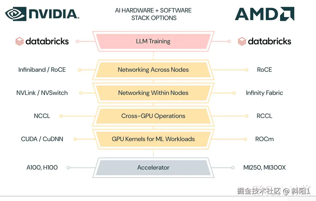 下图分别展示了英伟达和 AMD 的工具链架构,我们可以看到两者的层次架构都是十分相像的,最核心的区别实则在于中间的 libraries 部分,两家供应商均根据自己的硬件为基础 library 做了优化;此外在编译层面两方也会针对自身架构,在比如调度,算子融合等方面实现各自的编译逻辑;而在对外接口上双方都在争取提供给当今热门的框架和应用以足够的支持。