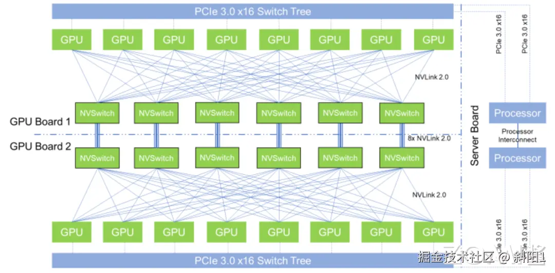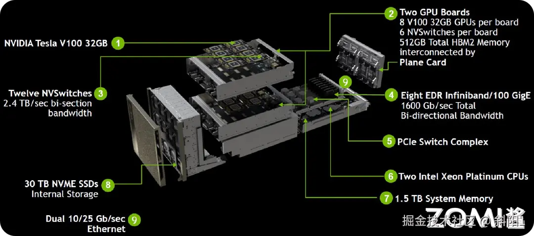 此外,NVSwitch1.0 技术是 Volta 架构中的一项重要创新,旨在提高 GPU 之间的通信效率和性能。NVSwitch1.0 可以支持多达 16 个 GPU 之间的通信,可以实现 GPU 之间的高速数据传输,提高系统的整体性能和效率,适用于需要大规模并行计算的场景,比如人工智能训练和科学计算等领域。