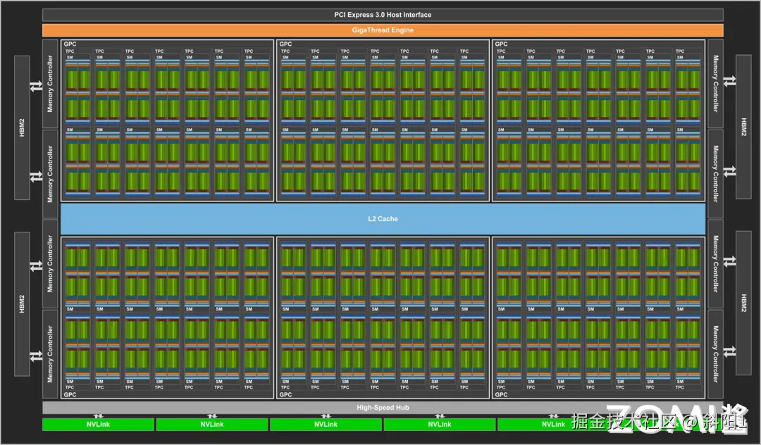 与上一代 Pascal GP100 GPU 一样,GV100 GPU 有 6 个 GPU 处理集群(GPCs),每个 GPC 有 7 个纹理处理集群(TPCs)、14 个流式多处理器(SMs),以及内存控制器。