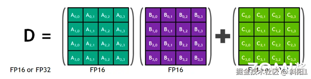 新的张量核心使 Volta 架构得以训练大型神经网络,GPU 并行模式可以实现深度学习功能的通用计算,最常见卷积/矩阵乘(Conv/GEMM)操作,依旧被编码成融合乘加运算 FMA(Fused Multiply Add),硬件层面还是需要把数据按照:寄存器-ALU-寄存器-ALU-寄存器方式来回来回搬运数据,因此专门设计 Tensor Core 实现矩阵乘计算。