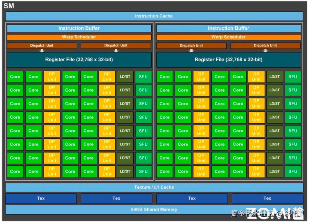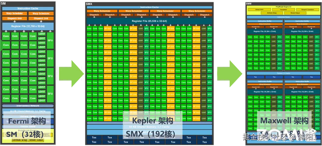 开普勒架构相比上一代 Fermi 架构,SM(Streaming Multiprocessor)更名为 SMX,但是本身的概念没有改变,每个 SMX 具有四个 warp 调度器和八个指令调度单元,允许同时发出和执行四个 warp。Fermi 架构共有 32 核,Kepler 架构拥有 192 核,大大提升了 GPU 并行处理的能力。Fermi 支持最大线程数是 1536,Kepler 最大线程数达到 2048。64 个双精度(Double-Precision,DP)单元,32 特殊功能单元(SFU)和 32 个 LD/ST(load/store)单元,满足高性能计算场景的实际需求。