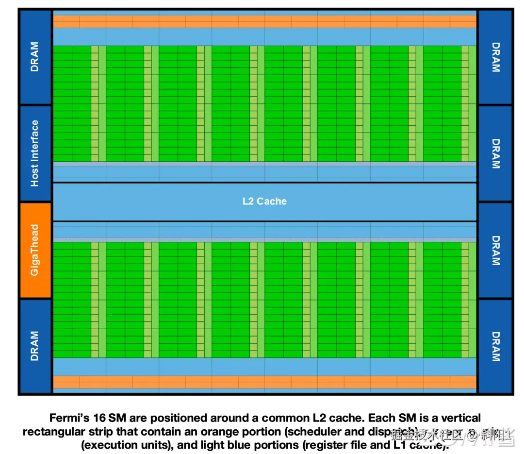 2010 年英伟达提出 Feimi 架构,最大可支持 16 个 SMs,每个 SM 有 32 个 CUDA Core,一共 512 个 CUDA Core,架构设计主要是以当时游戏用户的需求为主,因此整个 GPU 有多个 GPC(图形处理簇),单个 GPC 包含一个光栅引擎(Raster Engine)和 4 个 SM。