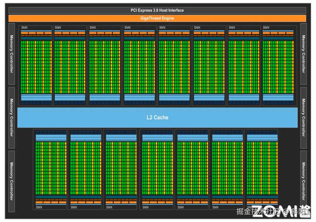 GPU 拥有 6 个 64 位内存分区,总共是 384 位内存,最多支持 6 GB GDDR5 DRAM 内存。主机接口通过 PCI-Express 连接 GPU 和 CPU。GigaThread 全局调度器将线程块分配给 SM 线程调度器。因为计算核心较多,因此将 L2 Cache 放在处理器中间位置,使得数据可以在 CUDA Core 之间快速传输。