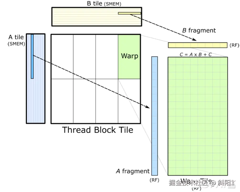 当执行矩阵乘法时,Warp 中的线程会协同工作,完成一系列乘法和加法操作。这个过程涉及到从共享内存(SMEM)加载数据到寄存器(RF)进行计算,然后将结果存储回寄存器或全局内存中。