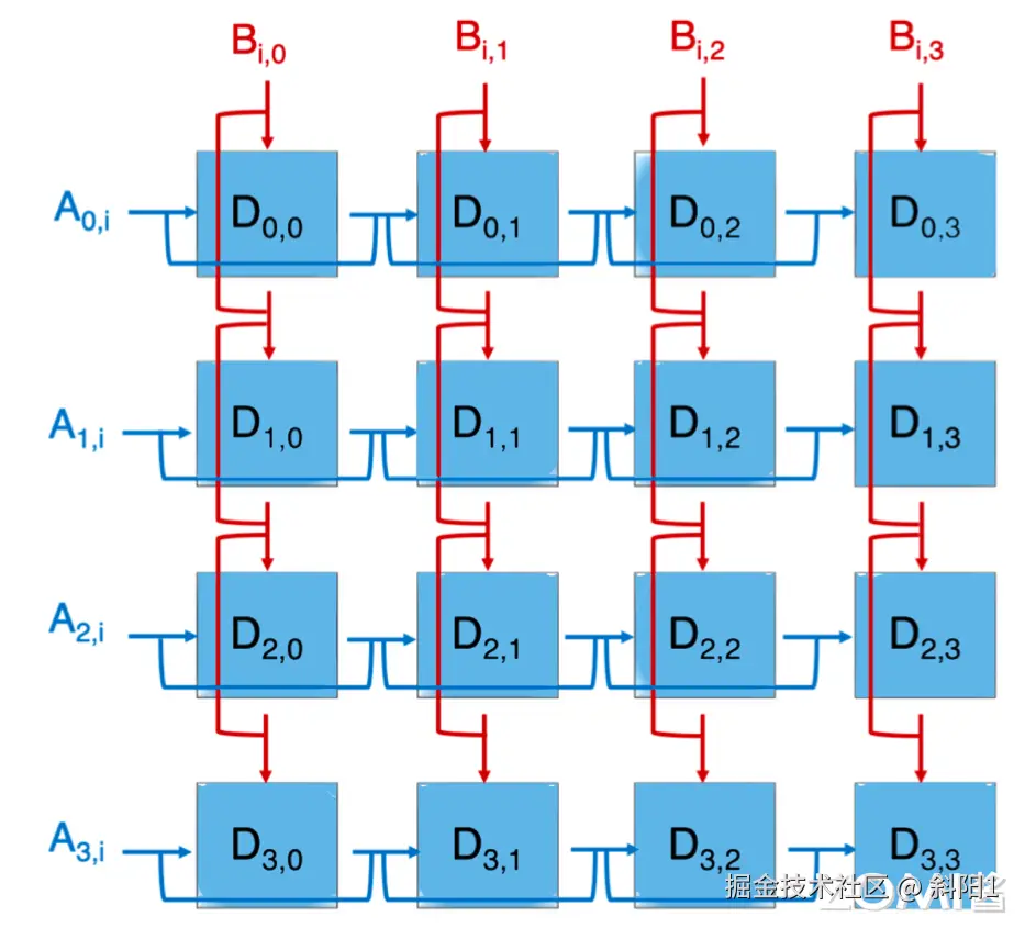 上面展示的矩阵 A 的一行跟矩阵 B 的一列进行 FMA,得到一个元素 ,即图中的第一个蓝色方块,那么整个矩阵计算时的电路图则如上图所示。它是一个简单的电路拼接,就是将 A 矩阵的每一行跟 B 矩阵的每一列进行相乘就可以得到整个矩阵的每一个元素。