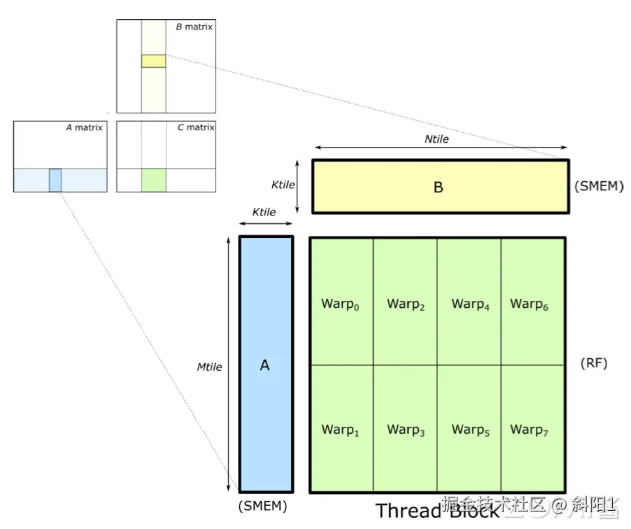 在进行矩阵乘法时,为了加速计算并减少内存访问延迟,通常会将矩阵 A 和矩阵 B 的部分数据加载到共享内存(Shared Memory,简称 SMEM)中。共享内存是线程块内所有线程都可以访问的一块快速内存,它允许线程之间进行数据交换和协作,而不必每次都从全局内存(Global Memory)中读取数据。