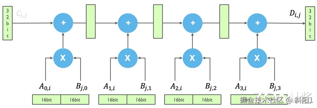 在 Tensor Core 实际计算的时候,实现输出一个元素的计算,即用 A 的一行乘以 B 的一列,就要有四条 Pipeline 的流水线。