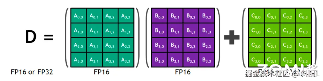 在 Tensor Core 里面并行执行的就是上述的形式,矩阵 A 乘以矩阵 B 等于 C 矩阵这么一个简单最核心操作。