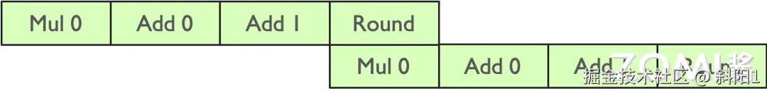 但实际上,Tensor Core 里面的乘法计算只有 Fp16,存储或者加法计算的时候是用到 Fp32 的,于是可以把刚才的一个乘法计算把它节省掉。那么如果实现两个元素相乘,就可以把两条流水并行起来,这个就是指令的流水,如下图所示。