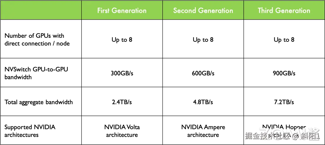 如上图所示,NVSwitch 技术从 Volta 架构到 Hopper 架构,经历了三代的演进与发展。在每一代中,每个 GPU 互联的芯片模组数量保持不变,都为 8 个,这意味着互联的基本结构保持了稳定性和一致性。随着 NVLink 架构的升级,GPU 到 GPU 之间的带宽却实现了显著的增长,因为 NVSwitch 就是 NVLink 具体承载的芯片模组,从 Volta 架构的 300GB/s 增加到了 Hopper 架构的 900GB/s。
