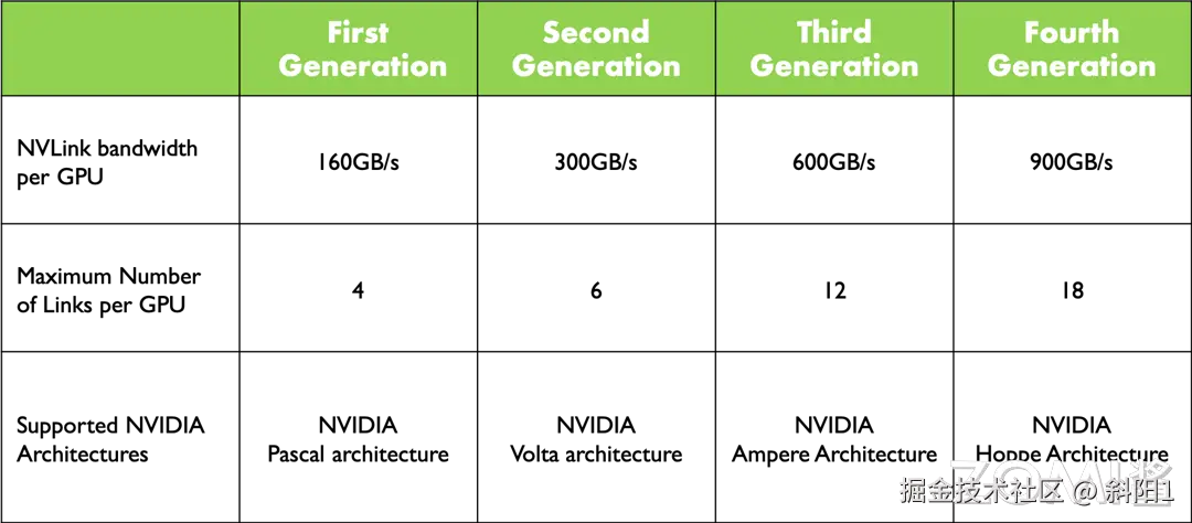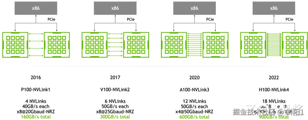 此外,由于单个 GPU 工作线程的内存有限,并且许多大模型的大小已经超出了单个 GPU 的范围。所以就需要实现跨多个 GPU 的模型训练,这种训练方式就涉及到了分布式通信和 NVLink。当谈及分布式通信和 NVLink 时,我们进入了一个引人入胜且不断演进的技术领域,本节我们将简单介绍分布式通信的原理和实现高效分布式通信背后的技术 NVLink 的演进。