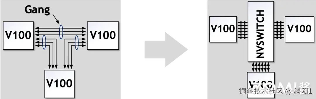 如上图所示,在没有 NVSwitch 的配置中,GPU 之间的连接通常是通过将 NVLinks 聚合成多个组(Gang)来实现的。这意味着多个 GPU 通过共享的 NVLink 链路进行通信。然而,这种方法的一个限制是任意两个 GPU 之间的最大带宽受限于它们所在 Gang 的 NVLink 数量和带宽。