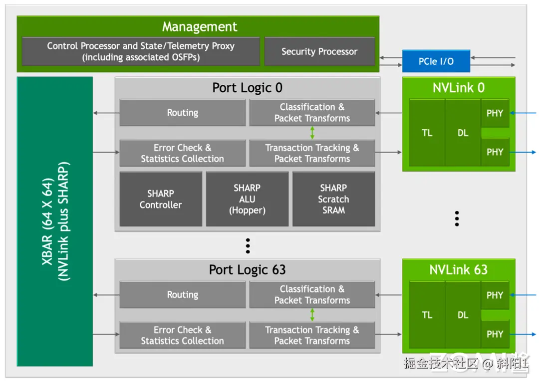 NVSwitch 中的交叉开关(XBAR),经过精心调整和优化,与 SHARP 模块的数据传输需求完美匹配。这一协同设计,确保了数据在 GPU 间传输时的高效率和低延迟,提升系统的整体性能。