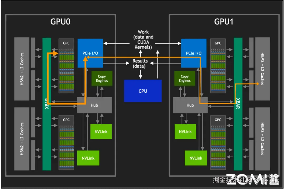 在多 GPU 系统中,NVLink 还起到了 XBARs 的作用,它作为不同 GPU 之间的桥梁,允许数据在 GPU 之间自由流动。还巧妙地避开了与 PCIe 总线的冲突,使得 NVLink 和 PCIe 可以作为互补的解决方案共存,共同为系统提供所需的数据传输能力。