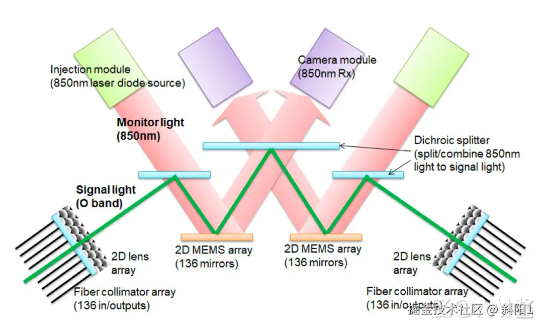 下面这个图解释了 Palomar OCS 的工作原理。绿色线条表示带内光信号路径。与带内信号路径叠加的是一个 850 纳米波长的监控通道(红色箭头),用于校准镜面。输入/输出的光学信号通过二维(2D)光纤准直器阵列(Fiber collimator array)进入光学核心,每个准直器阵列由一个 NxN 光纤阵列和 2D 透镜阵列组成。这个的核心是其中的两组 2D MEMS 阵列。MEMS 的镜面被在监控通道的校准下,被驱动、倾斜以将信号切换到相应的输入/输出准直光纤。