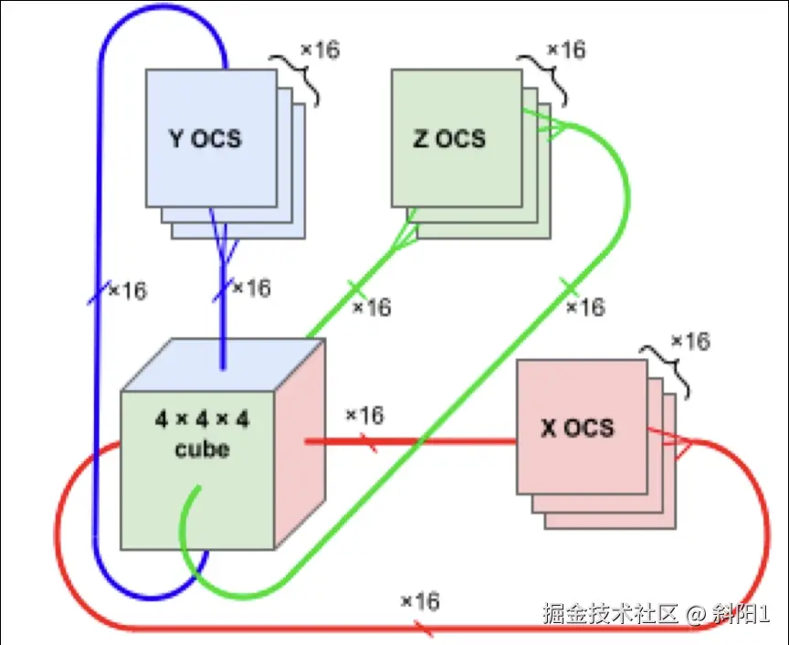 谷歌在 TPU v4 Pod 中应用了光交换器(OCS)为了避免计算等通信。在如此大规模的超级计算机中,芯片间互联很大程度上决定整体计算效率;如果数据互联效率不够高的话,很多时候芯片都在等待来自其他芯片数据到达以开始计算。所以必须确保芯片之间互联高带宽,低延迟。而光互连对于物理距离较远的芯片就成为了首选。OCS 由 64 ()颗 TPU 构成一组 Slice 间互连,实现了 Pod 内 Slice 间全光互连(4096 TPUs);当然也可用于 Pod 之间互连而不仅局限于芯片之间。