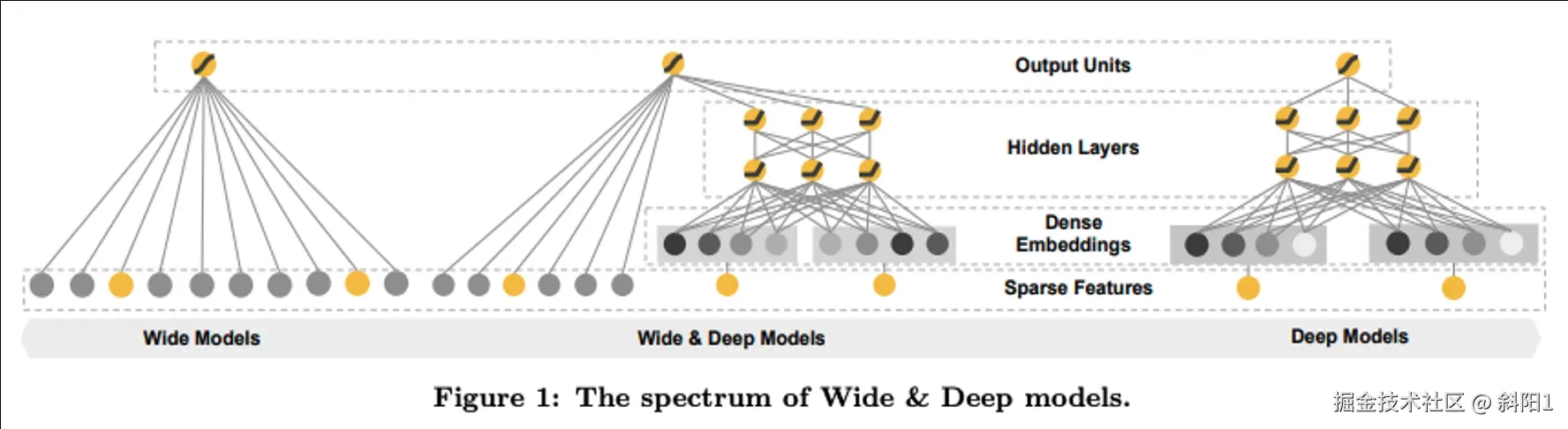 下面的图是一个在搜推场景非常经典的模型框架,叫做 Deep & Wide Model。Wide&Deep 其实是一个框架,wide 部分可以是任意广义线性模型,而 Deep 部分就是一个 Embedding 的全连接神经网络。可以看到图片中 "Deep Models"的部分,用户的稀疏特征被先被处理成稠密 Embeddings 再进入中间的隐藏层,协同“Wide Models”输出最终的单元。