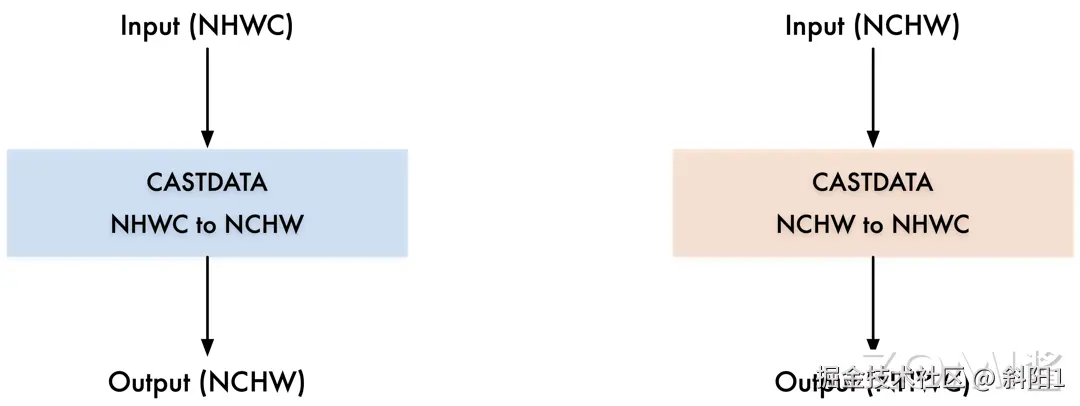 下面我们来看看数据转换具体是如何操作的。如下图所示,这两个都是数据转换的算子,数据转换我们在这里用 CASTDATA 算子来表示,左侧输入的数据格式为 NHWC,输出的数据格式为 NCHW,那么就需要一个数据转换算子节点来将数据格式由 NHWC 转换为 NCHW,右侧则相反过来,此处不再赘述。