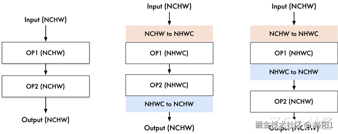 接下来,我们来看略复杂一些的数据转换。如下图所示,首先像最左侧,此处我们两个算子使用的数据格式与输入输出时都相同,为 NCHW,那么此时 AI 编译器中就不需要加入数据转换节点。