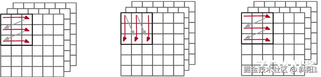 除了 ND 和 NZ 格式,还有其他数据格式,如下图所示,图中最左侧小 z 大 Z,即为 ND 格式示意图,块内按照行排序,块间也按照行排序,常用于特征图的数据存储。