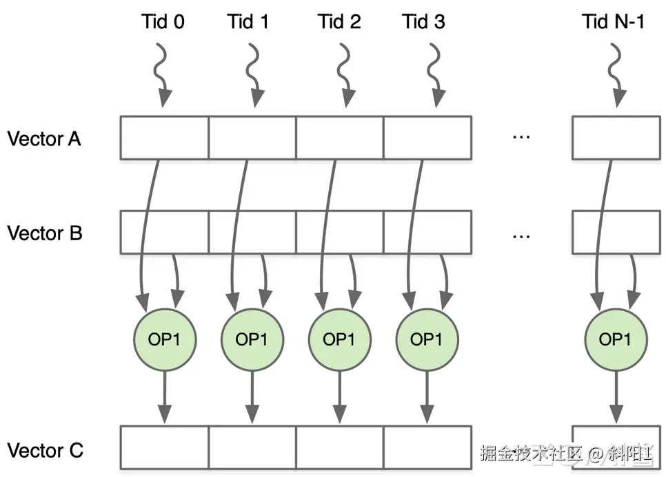 还是以之前的数组相乘 为例,两个等长数组 Vector A 与 Vector B,需要每个元素逐一对应相乘后得到 Vector C。SIMT 给每个元素分配一个线程,一个线程只需要完成一个元素的乘法,所有线程并行执行完成后,两个数组的相乘就完成了。