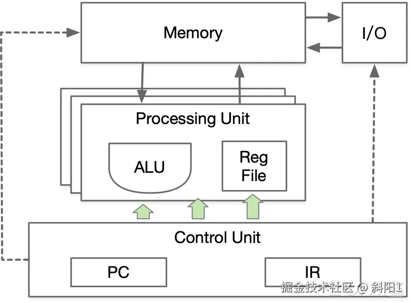 SIMT 类似 CPU 上的多线程,有多个计算核心系统,每一个核心中有独立的寄存器文件(Register File,RF)、计算单元(Arithmetic Logic Unit,ALU),但是没有独立指令缓存(Instruction Cache)、解码器、程序计数器(Program Counter register),命令从统一的指令缓存广播给多个 SIMT 核心。因此 SIMT 的所有核心各自独立,在不同的数据上执行相同的计算操作,即执行命令相同,多个线程各有各的处理单元,SIMD 则是共用同一个 ALU。