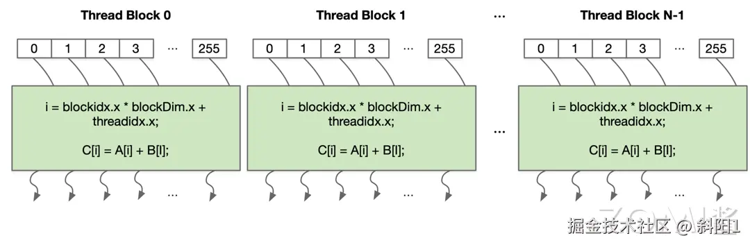 // 使用 blockIdx.x 和 blockDim.x 来访问块索引和块维度