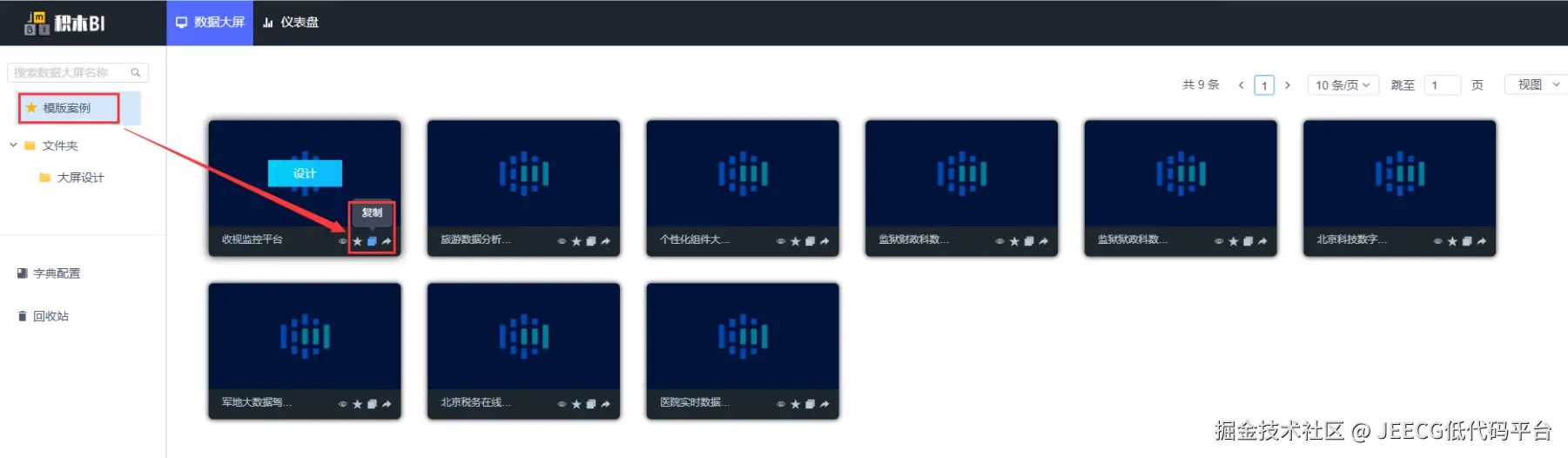 在模版案例中复制一个相近的模版,再修改大屏的组件及数据即可快速创建一个大屏了。