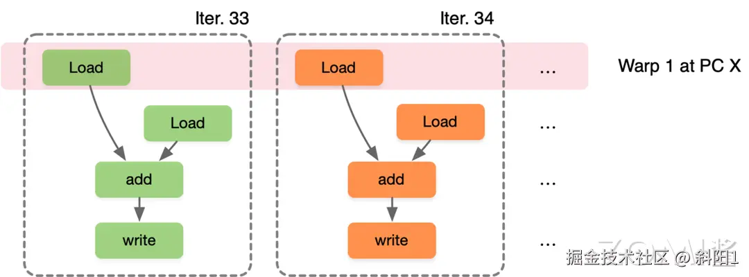 SIMT 架构 GPU 通过细粒度的多线程(Fine-Grained Multi-Threading,FGMT)调度,将处理器的执行流水线细分为更小的单元,使得不同线程的指令可以交错执行,从而减少指令执行的等待时间和资源浪费,以此来实现访存和计算并行。