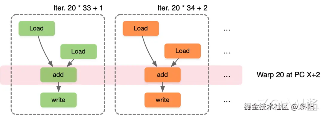 假设一个 Warp 包含 32 个线程,如果需要进行 32000 次迭代,每个迭代执行一个线程,因此需要 1000 个 warp。第一个迭代 Warp0 执行第 032 个线程,第二个迭代 Warp1 执行第 3364 个线程,第二十一个迭代 Warp20 执行第 20x33+1 ~ 20x33+32 个线程,可以看出 SIMT 是标量指令的多个指令流,可以动态地把线程按 Wrap 分组执行,使并行度增加。