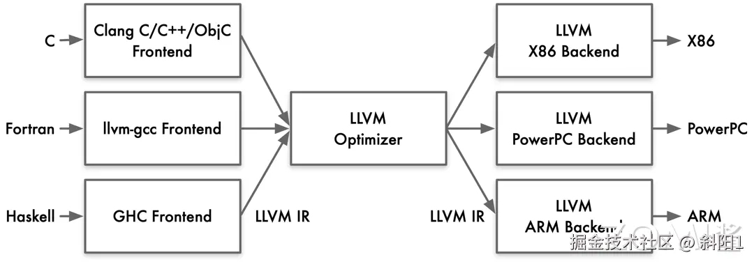 例如:LLVM 把前端和后端给拆分出来,在中间层明确定义一种抽象的语言,这个语言就叫做 IR。定义了 IR 以后,前端的任务就是负责最终生成 IR,优化器则是负责优化生成的 IR,而后端的任务就是把 IR 给转化成目标平台的语言。LLVM 的 IR 使用 LLVM assembly language 或称为 LLVM language 来实现 LLVM IR 的类型系统,就指的是 LLVM assembly language 中的类型系统。