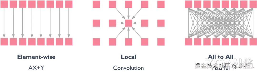 在 AI 计算模式中,不是所有的计算都可以是线程独立的。计算中数据结构元素之间的对应关系有以下三种: